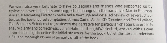 Martin Pearson, Director of Chiltern Communications, has been acknowledged for his support in proof reading and providing analysis on various books by colleagues, such as Agile and Business Analysis.